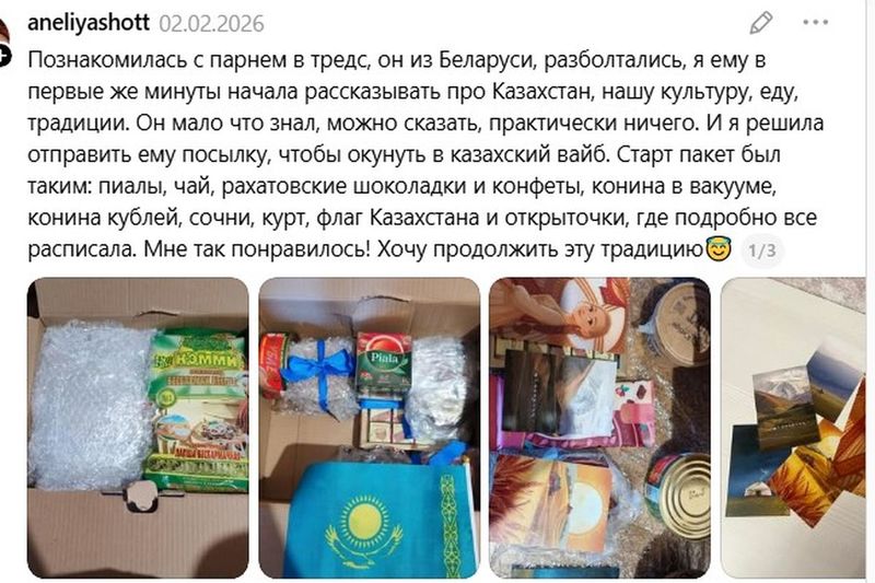 Молодой человек из Беларуси пообещал отдариться. Так что на некоторое время белорусы замерли в ожидании. Все переживали, что посылка окажется недостаточно «представительной» и окунет казахскую принцессу в белорусский вайб, не по ушки, а только до колена.