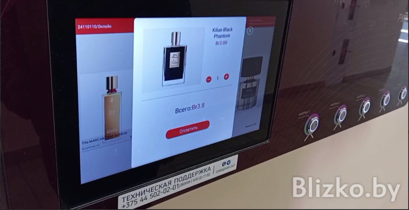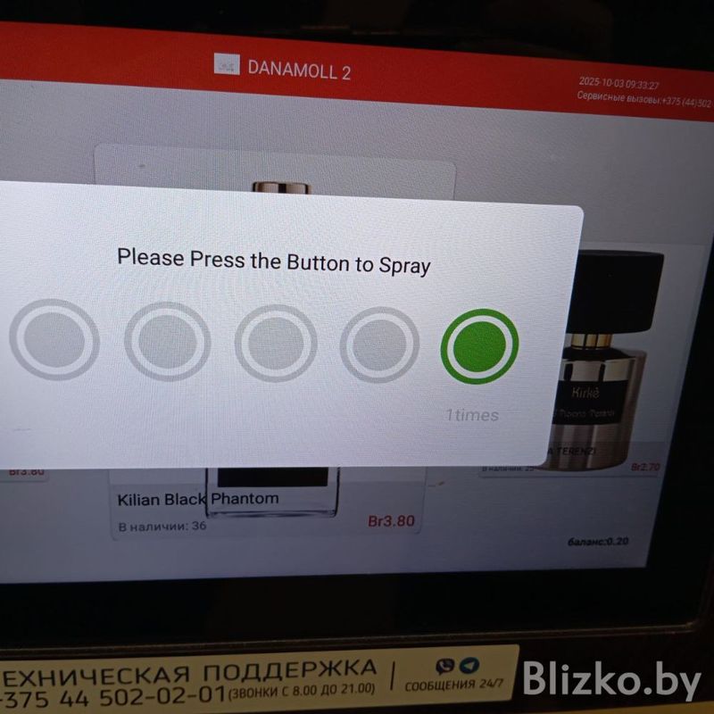 Из всех представленных ароматов наш выбор пал на Kilian black phantom. Мы «досвайпали» до него на сенсоре, и оплатили один «пшик». Кстати, на момент использования автомата в нем оставалось еще 36 распылений этой туалетной воды. Их оставшееся количество выводится на экране.