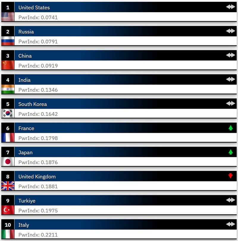 Портал Global Firepower опубликовал обновленный рейтинг государств по уровню военной мощи. Согласно ежегодной оценке, Первое место в этом списке заняла армия США. На втором месте − Россия. Третье место досталось Китаю.