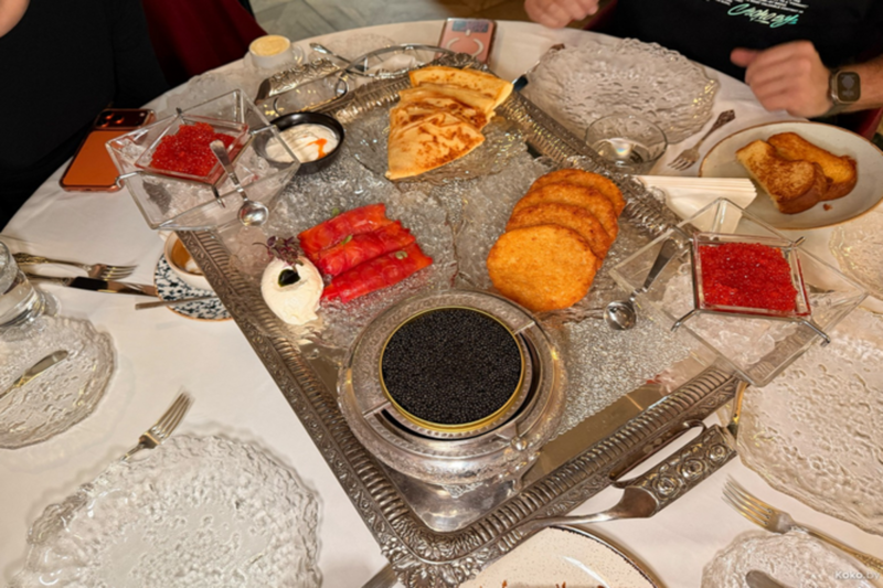 «На серебряном подносе с серебряными ложками конца 19 века икра черная 250г, икра красная 250 г, лосось своей соли 100 г и блины с драниками, которые можно дозаказывать, пока не станет плохо. Стоит сет 1200 рублей, рассчитан на компанию от 4 до 6 человек», — отметил блогер.