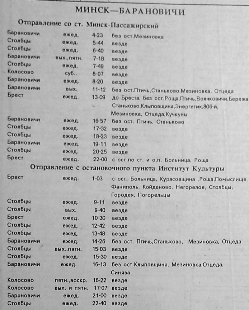Вот расписание электричек по столбцовскому направлению на зиму 1995/1996 годов. В ходу до 29 электричек, в летний сезон их было еще больше.