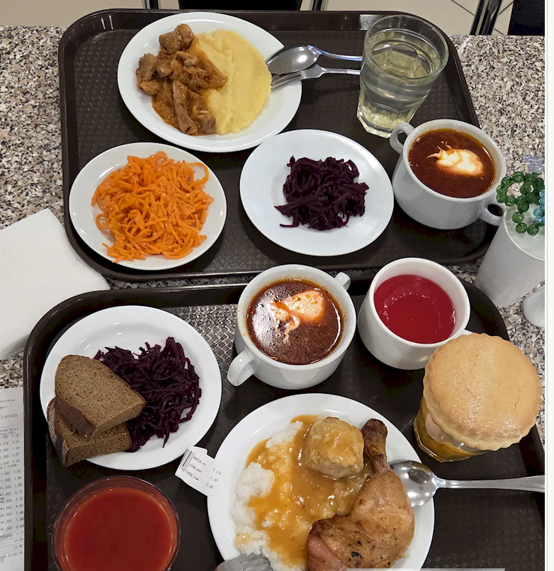 На двоих двоих они заказали: борщ «Украинский» со сметаной, тефтели и поджарку из свинины, рисовую кашу и картофельное пюре, салаты из свеклы и пряной моркови, компот из кураги, кисель, лимонный напиток, томатный сок, хлеб, а на десерт — сочник с маком.