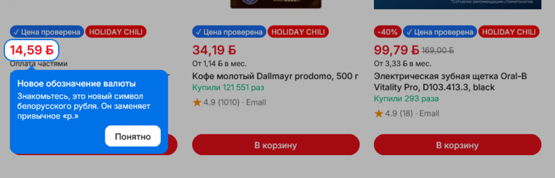 Один из белорусских маркетплейсов начал использовать новый графический знак белорусского рубля, подметил Telegraf.by.