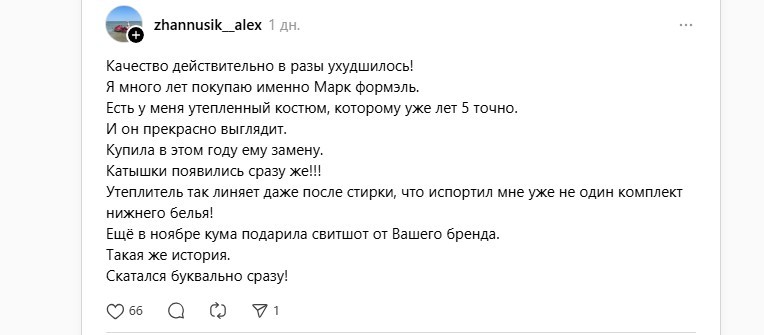 «Качество, действительно, в разы ухудшилось! Я много лет покупаю именно Мark Formelle. Есть у меня утепленный костюм, которому уже лет 5 точно. И он прекрасно выглядит. Купила в этом году ему замену. Катышки появились сразу же!!! Утеплитель так линяет даже после стирки, что испортил мне уже не один комплект нижнего белья!» — Возмущались комментаторы.