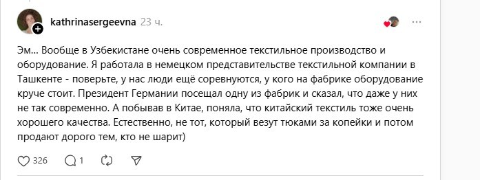 «Где собирают хлопок, изготавливают пряжу, там сейчас и шьют одежду. Не нравится — не покупайте! Кстати, наша продукция продается как в Европе, так и в США. А с Беларусью у нас тесные связи. У нас много чего белорусского продают. И это отлично», — призвали белорусов к миру, дружбе и налаживанию торговых связей комментаторы из солнечного Узбекистана.