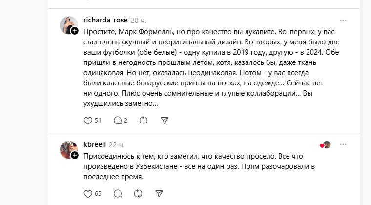 «Не могу понять, Мark Formelle это белорусский бренд или нет? Почему моя пижама сделана в Узбекистане, а не в Беларуси?! Я сейчас такой скандал учиню», — написала пользовательница Threads.