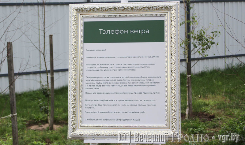 В деревне Голынка под Гродно появился первый в Беларуси «телефон ветра», пишет «Вечерний Гродно». Он установлен на территории дома Святого Перегрина, его установили силами сотрудников социально-благотворительного учреждения «Центр помощи жизни». Это благотворительный негосударственный некоммерческий фонд, который занимается оказанием паллиативной помощи (хоспис). Сотрудники ежедневно сталкиваются с уходом из жизни своих подопечных из-за неизлечимой онкоболезни.