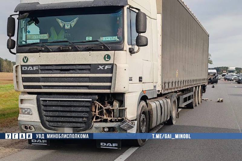 Авария произошла в 09:55 в Минском районе. По предварительным данным, 34-летний водитель, управляя машиной DAF с полуприцепом, двигался в крайней левой полосе в направлении столицы. При перестроении в крайнюю правую полосу он столкнулся с автомобилем Toyota под управлением 46-летней женщины.