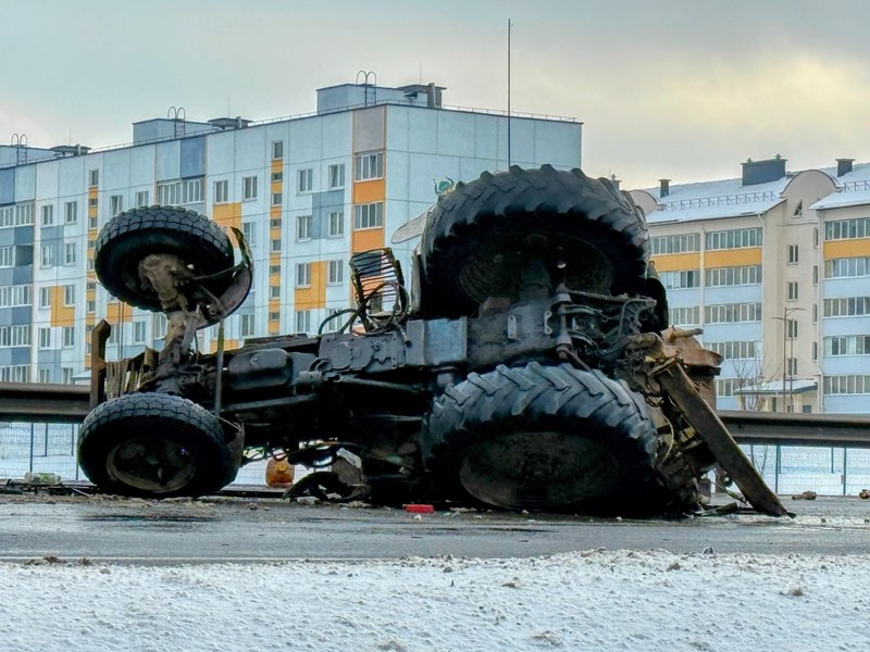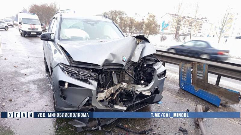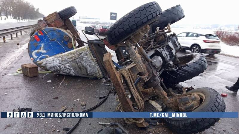От удара трактор с прицепом опрокинулся на проезжую часть, причинив повреждения ехавшему в попутном направлении в крайне левой полосе внедорожнику BMW, которым управляла 44-летняя минчанка.