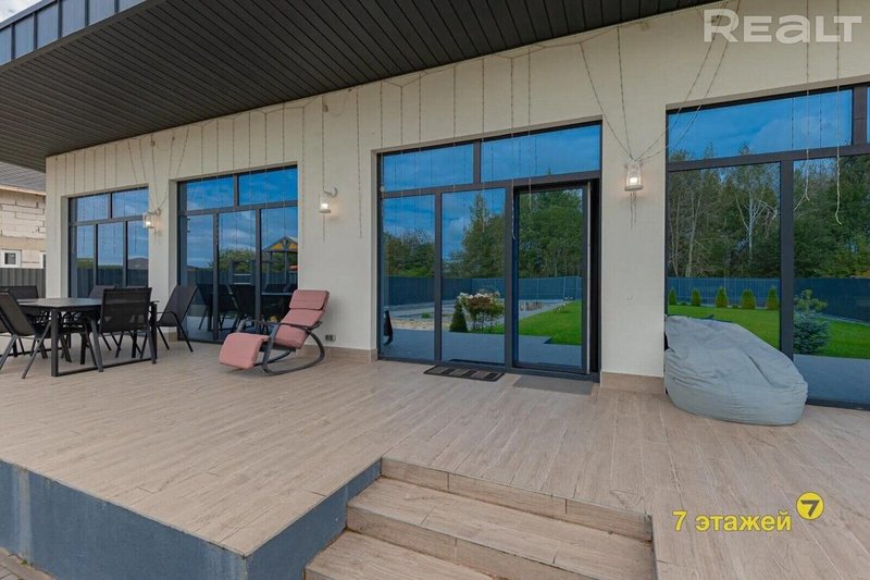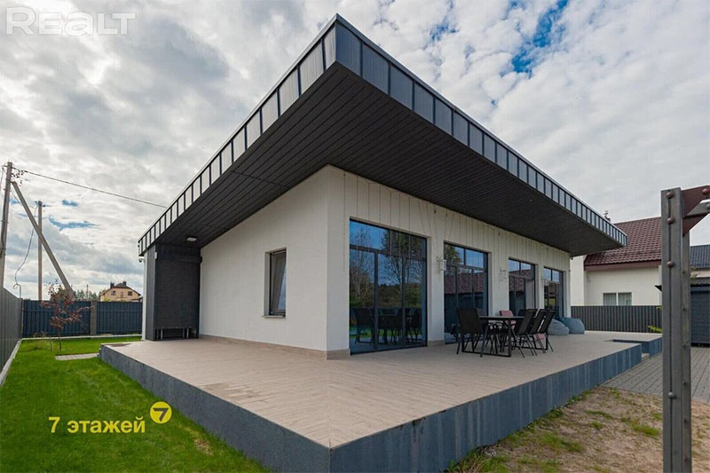 Дом построен в 2021 году, одноэтажный, с односкатной крышей, окнами в пол и террасой с трех сторон. Просторная планировка включает гостиную с панорамным остеклением, островную кухню, две спальни, большой санузел, прихожую и топочную. Интерьер выполнен в дизайнерском стиле, полы с подогревом из плитки Италии и Испании, стены покрыты венецианской штукатуркой.