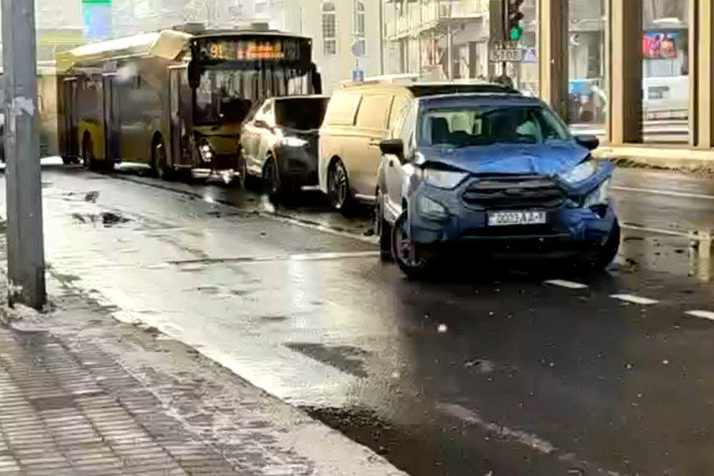 На пересечении улицы Немига и улицы Ленина, а конкретнее — под мостом, который перекинут над улицей Немига, произошло массовое ДТП с участием сразу нескольких автомобилей и автобуса.