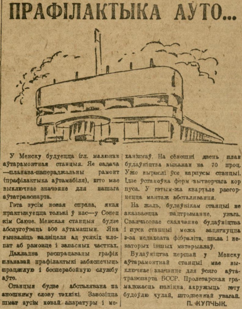 И здание было построено, судя по газетной публикации. Причем она стала первой в Минске авторемонтной станцией.