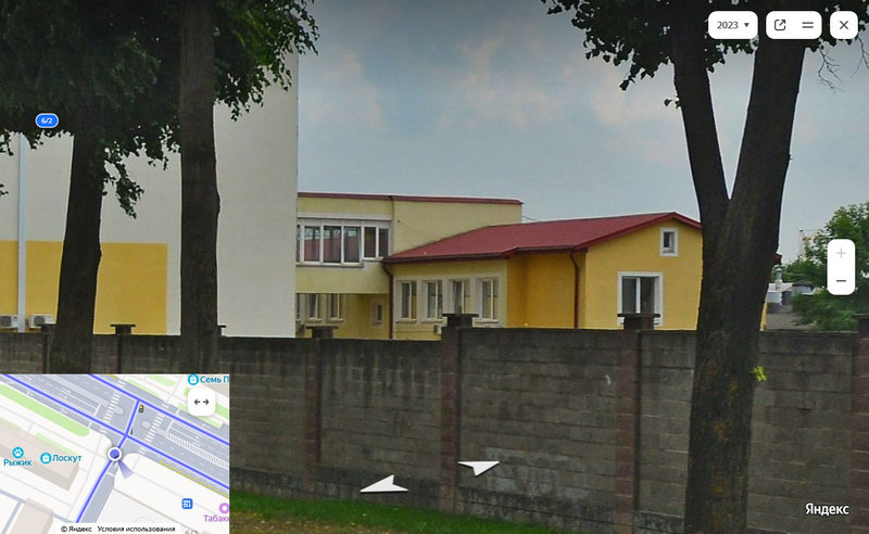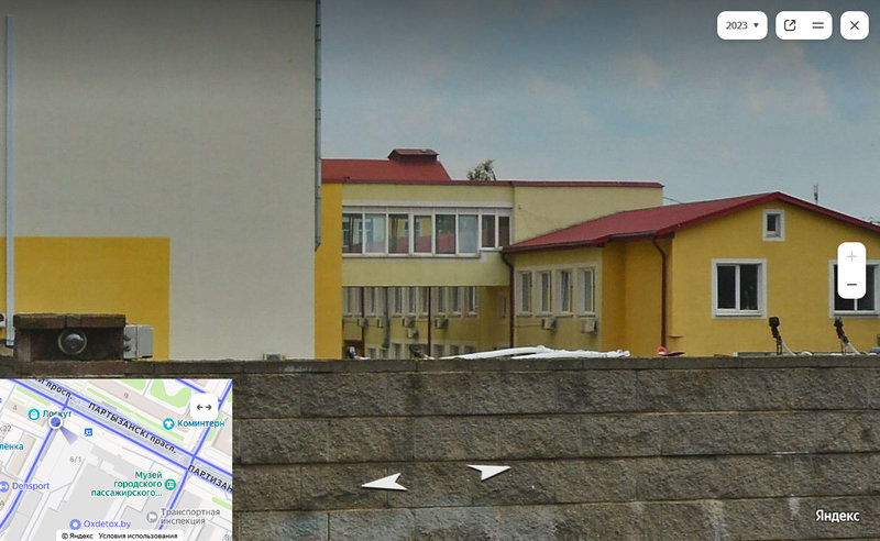 Вот на панорамном снимке можно видеть желтый фасад здания (с кондиционерами), к которому на уровне второго этажа перекинута галерея от более позднего корпуса, стоящего ближе к Партизанскому проспекту.