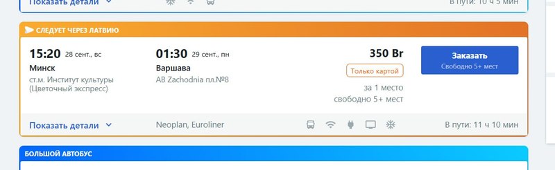 Путь в этом случае предстоит неблизкий. По расписанию поездка из Минска в Варшаву займет минимум 11 часов. Автобус выезжает из Минска в 15.20 и прибывает в Варшаву в 1.30. В обратном направлении выезд из Варшавы в 22.10. В Минске этот автобус будет в 9.00.