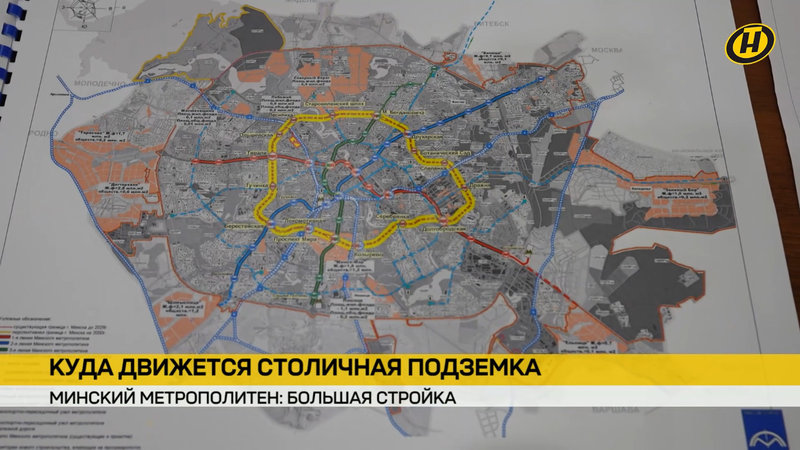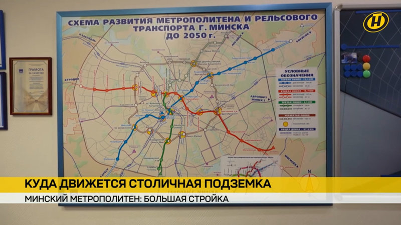 Там немало говорят про сами строительные работы, но нас сейчас интересуют именно схемы. Сначала в интерьерах «Минскметропроекта» нам показывают схему, которую мы уже видели. Она называется «Схема развития метрополитена и рельсового транспорта г.Минска до 2050 года».