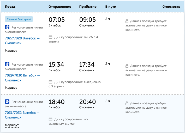 Из Витебска в Смоленск первые поезда пойдут 3 апреля, на следующий день добавится еще одна пара, а с 1 мая — сезонный поезд. Отправления будут такими: 07:05 (по понедельникам и субботам), 15:34 (ежедневно) и 18:40 (по выходным). Время в пути — ровно 2 часа с учетом 10-минутной остановки на станции Рудня.
