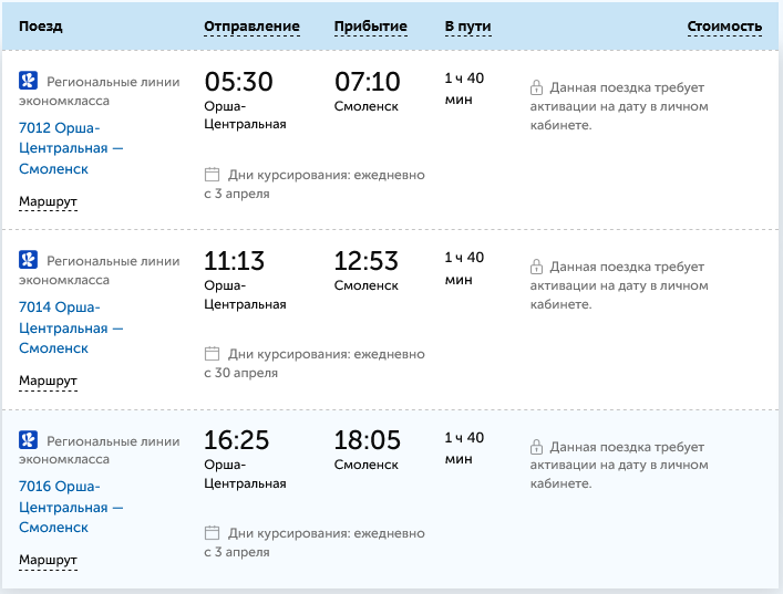 Из Орши две пары поездов пойдут с 3 апреля, а с 30 апреля добавится еще одна дневная сезонная электричка. Поезда будут отправляться в 05:30, 11:30 (сезонная) и 16:25, время в пути — 1 час 40 минут с учетом единственной 10-минутной остановки на станции Красное. Все электрички из Орши в Смоленск будут ходить ежедневно.