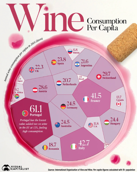 Аналитическое агентство VisualCapitalist изучило, сколько вина потребляют в тех или иных странах и кто в лидерах. Учитываются только граждане в возрасте от 15 лет и старше.