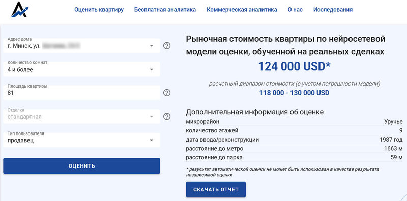 В основе сервиса — мощный алгоритм искусственного интеллекта, использующий глубокое обучение для анализа рыночных данных. Он работает с официальными данными и использует базу данных о 80.000 реальных сделок с квартирами в Минске. Для оценки используются 15 факторов, включая информацию о сделке (дата), характеристики квартиры (количество комнат, общая площадь, материал стен, дата ввода, состояние квартиры) и локации (местоположение квартиры, микрорайон, доступность метро, остановок общественного транспорта, парка, расположение в санитарно-защитной зоне). Вот по этой ссылке можно скачать PDF-документ почитать подробнее, как настраивалась модель оценки. Утверждается, что в большинстве случаев погрешность оценки не превышает 5%, что гарантирует надежность и объективность результата.