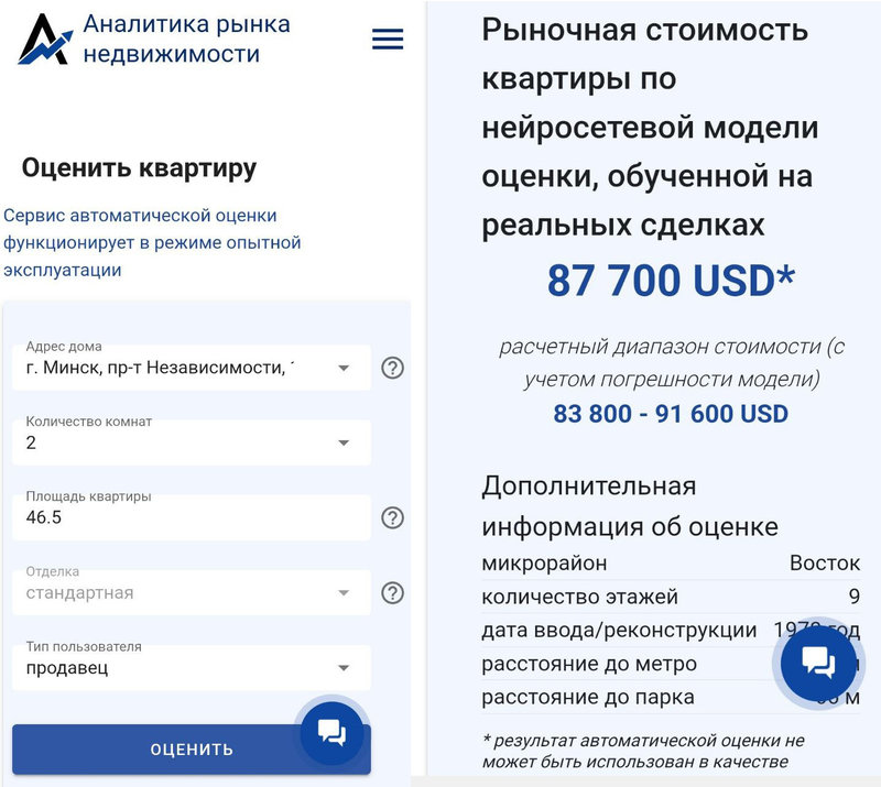 Blizko.bу оценил работу сервиса. Так, мы установили, что площадь квартиры можно вводить с точностью до одной десятой квадратного метра (сотые доли ввести не получится). Также в нашем случае не было никакой разницы между тем, какой тип пользователя указан: продавец или покупатель. На выходе сервис показывает год постройки дома, число этажей и расстояние до ближайших станций метро или парков.