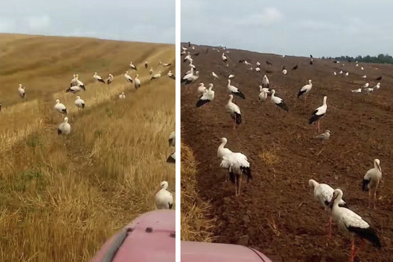 Судя по видео, мужчина работает в поле. Скорее всего, такое количество аистов можно было наблюдать в Браславском районе.