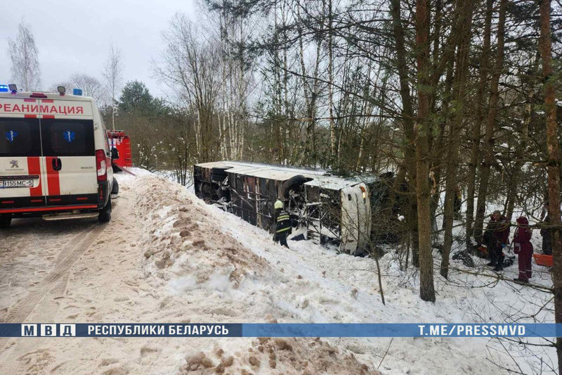 В субботу 14 февраля около 14:20 в Логойском районе 45-летний водитель автобуса DAF на закруглении дороги вправо, по предварительной информации, не справился с управлением. Автобус проехал через встречную полосу, съехал в левый по ходу движения кювет и опрокинулся.