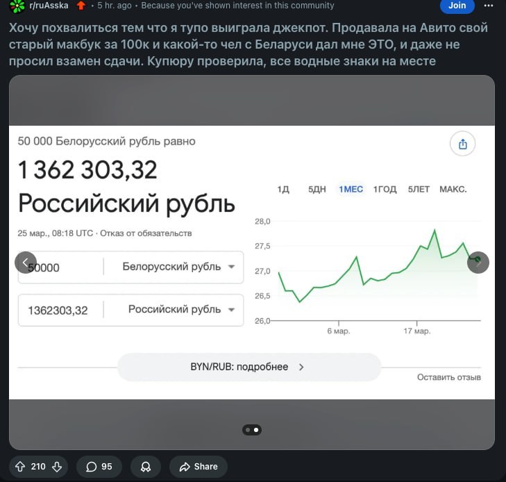 Девушка продавала на Авито свой MacBook за 100 тысяч российских рублей (примерно 3 тысячи 664 рубля 30 копеек по белорусскому курсу). На объявление откликнулся белорус, который вручил продавцу 50 тысяч белорусских рублей. Девушка проверила курс в интернете и увидела внушительную сумму — 1 миллион 362 тысячи 303 рубля и 32 копейки.