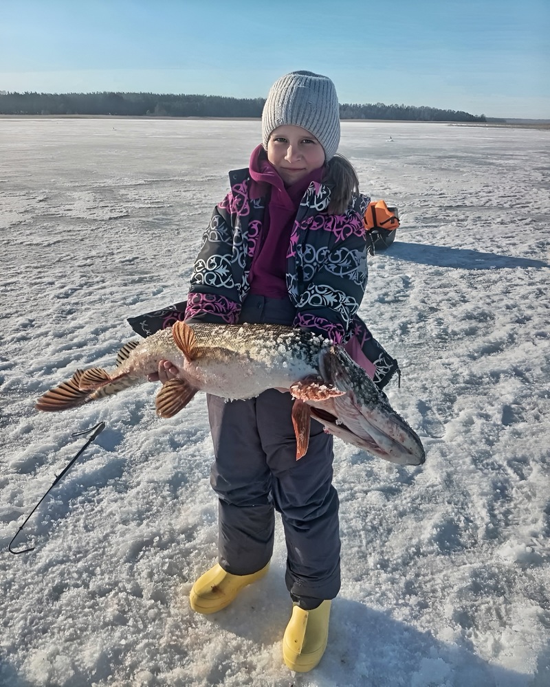 «Озеро Струсто в Браславском районе Витебской области. 8 Марта юная рыбачка провела на озере, обновив свой рекорд — 5кг. Щука поймана на жерлицу в 9 часов утра на глубине 6,5 м. Живец — плотва», — отметил под фото автор.