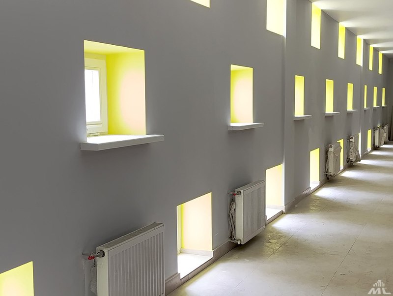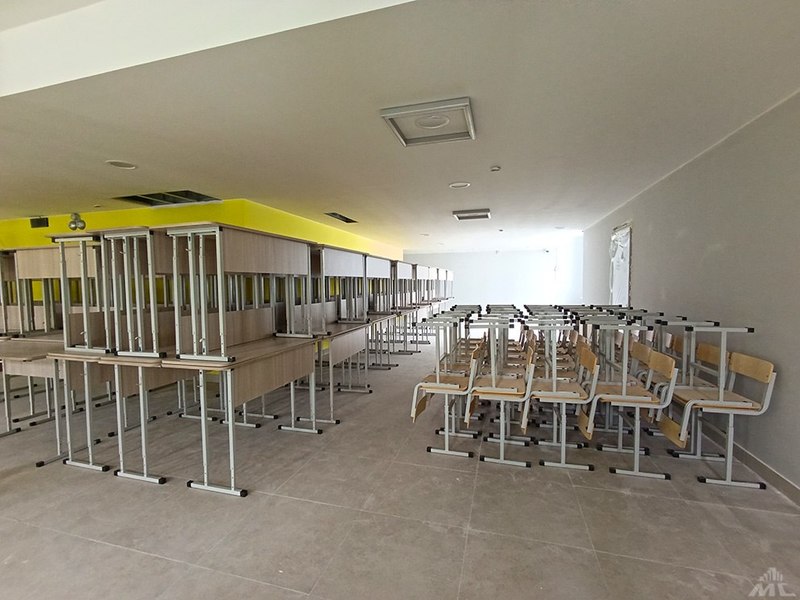 Уточняется, что классы уже готовы – осталось расставить мебель, которая активно завозится на объект и собирается. Уложено напольное покрытие, смонтированы баскетбольные щиты и штанги для волейбольных сеток в спортзале. В актовом зале начинают укладывать паркет.