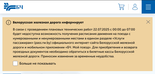 Белорусская железная дорога предупреждает: в связи с проведением плановых технических работ 22 июля с 00:00 до 07:00 будет недоступна возможность получения расписания движения на поезда с нумерованными и ненумерованными местами на сайте БЖД и в мобильном приложении «БЧ. Мой поезд». Для приобретения и возврата проездных документов необходимо обратиться в билетные кассы Белорусской железной дороги.