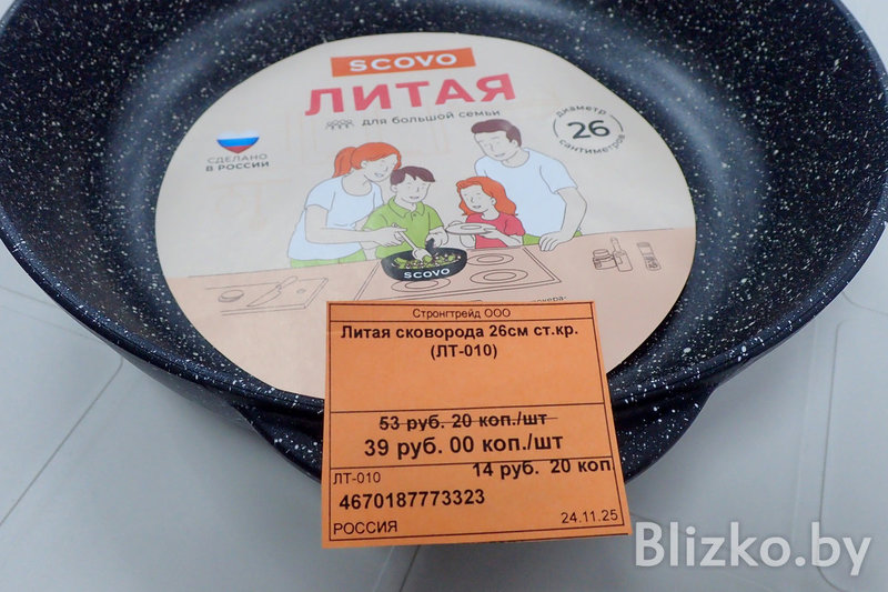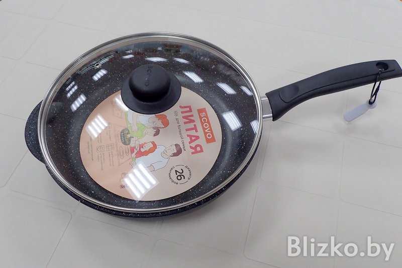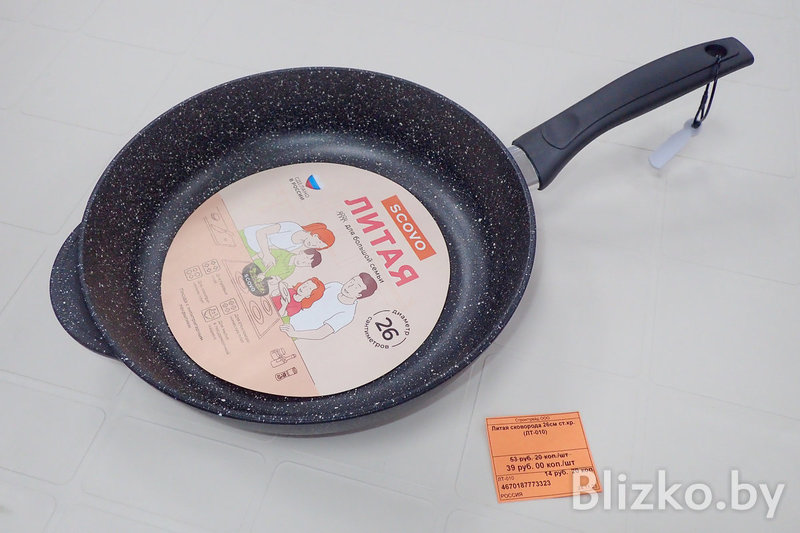 Литая сковорода Scovo диаметром 26 сантиметров с высокими бортиками. Еще сегодня она стоит 53 рубля 20 копеек, а уже завтра и вплоть до 30 ноября будет стоить ровно 39 рублей.