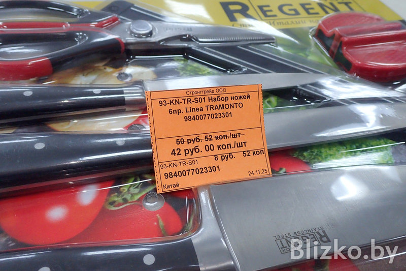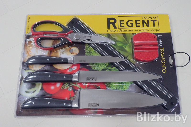 Набор кухонных инструментов Regent Tramonto: три ножа, ножницы и магнитный держатель. Сегодня стоят 50 рублей 52 копейки, а завтра вы уже увидите на ценниках ровно 42 рубля.
