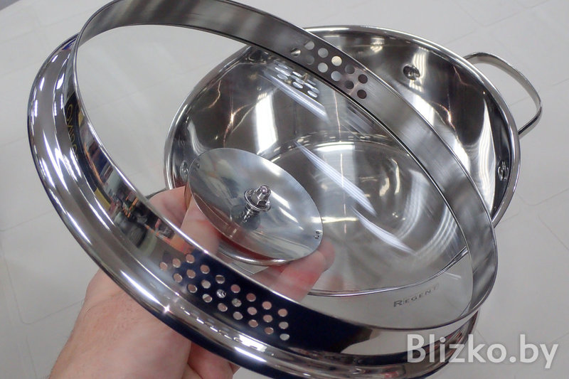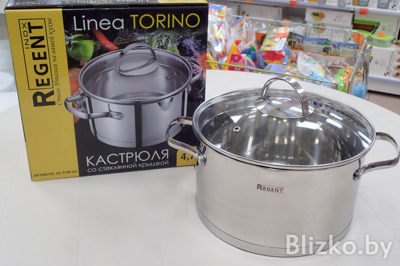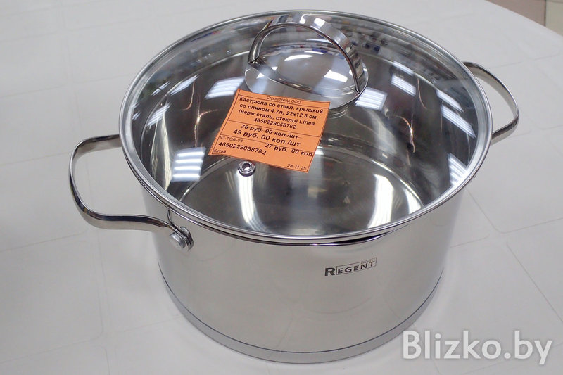 Кастрюля Regent Torino объемом 4,7 литра. В бортиках крышки есть дренажные отверстия, так что кастрюлю можно использовать как дуршлаг. Цена сегодня составляет 76 рублей, а уже завтра на красном ценнике будет 49 рублей.