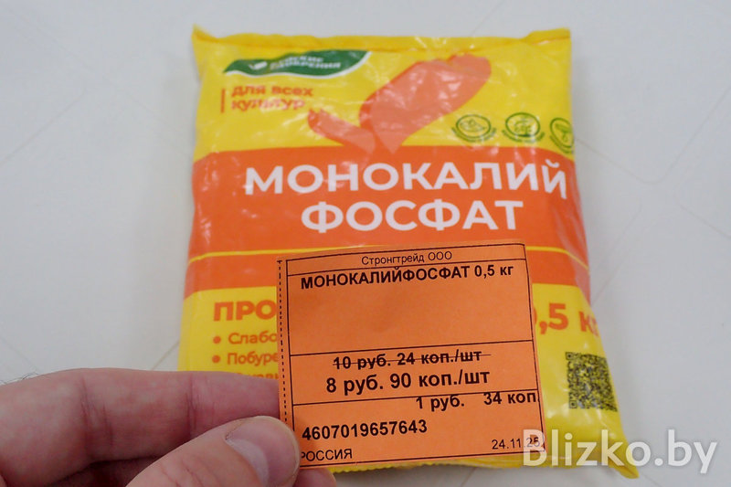 Пакет удобрений монокалий фосфат на 500 граммов. Сегодня еще по 10 рублей 24 копейки, а завтра по 8 рублей 90 копеек за пакет.