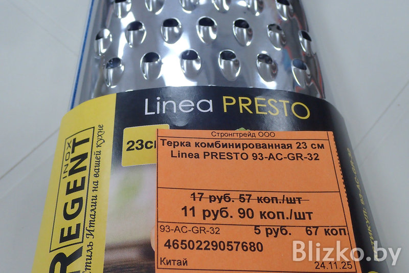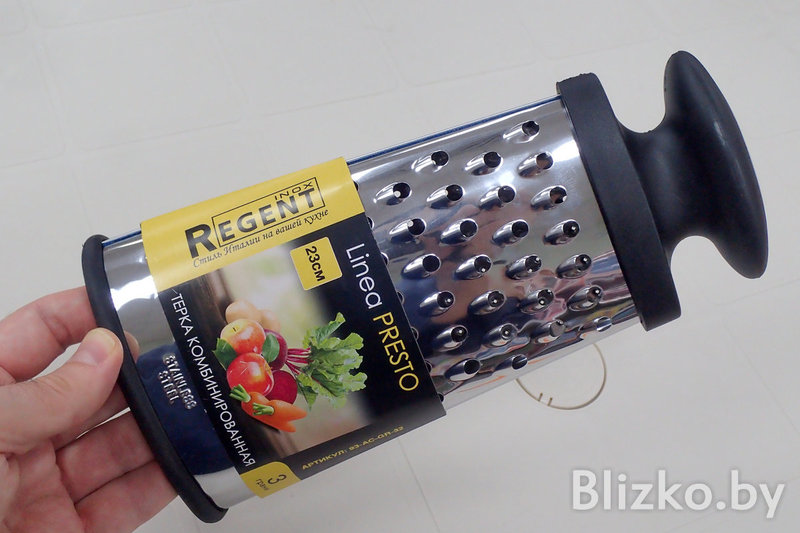 Терка комбинированная трехгранная высотой 23 см Regent Presto. Сегодняшний ценник — 17 рублей 57 копеек. А завтра вы ее заберете за 11 рублей 90 копеек.