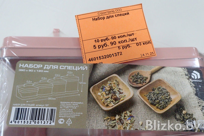 Набор для специй — четыре емкости разного объема с крышками. Сегодня еще продается за 10 рублей 90 копеек, а завтра вы его увидите с ценником 5 рублей 90 копеек.