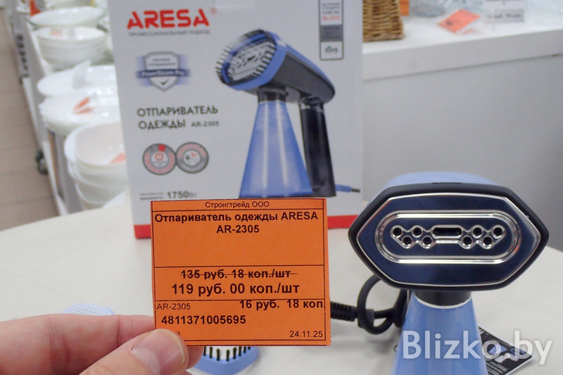 Отпариватель одежды Aresa мощностью 1750 Вт. Этот чудо-агрегат сегодня продается за 135 рублей 18 копеек, а завтра вы его сможете купить ровно за 119 рублей.