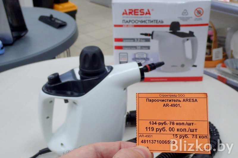Пароочиститель Aresa мощностью 1059 Вт и давлением 3,2 бара. Цена на вторник — 134 рубля 78 копеек, цена со среды по воскресенье — ровно 119 рублей.
