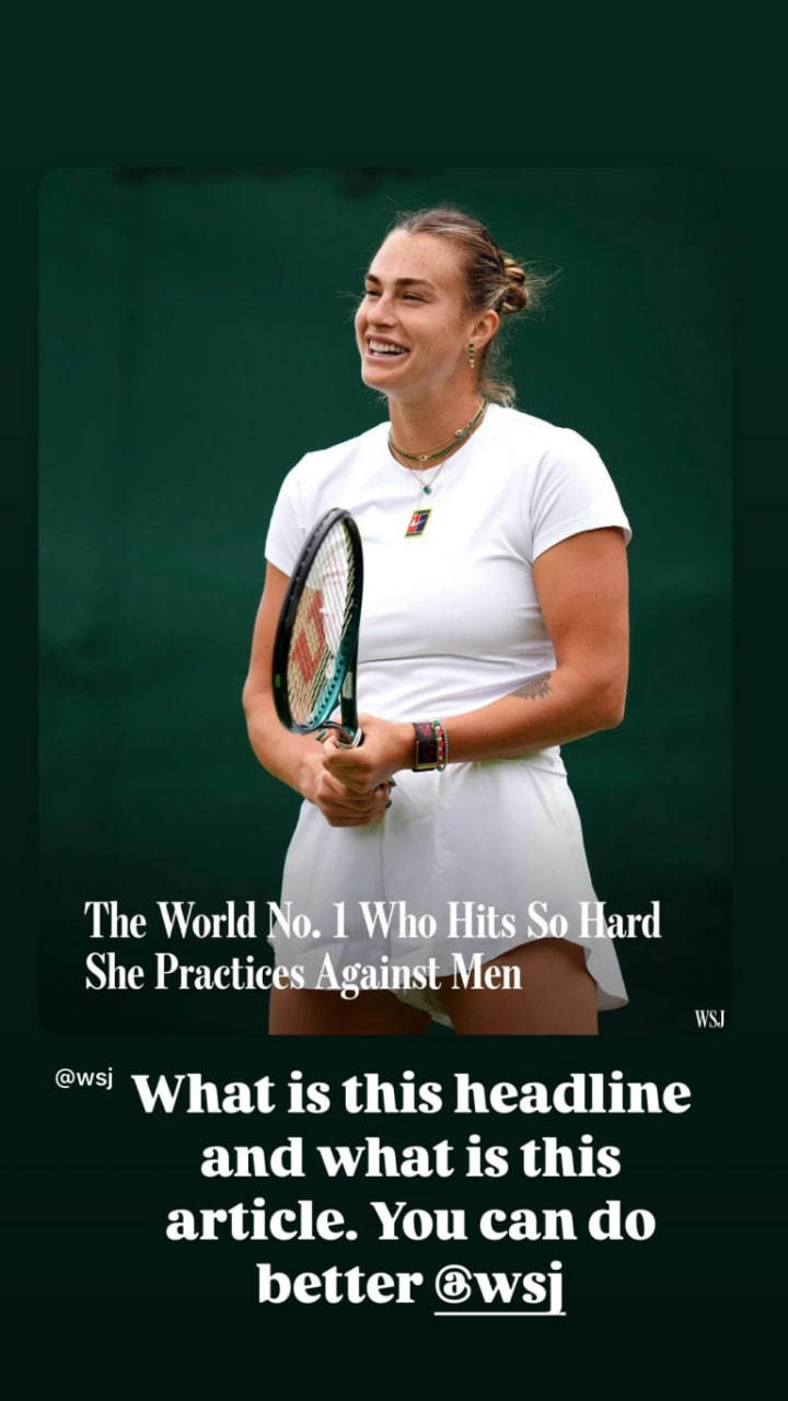 Экс-первая ракетка мира Мария Шарапова высказала свое недовольство по поводу работы The Wall Street Journal. Издание выпустило статью об Арине Соболенко с заголовком «Первая ракетка мира бьёт так сильно, что тренируется с мужчинами». В материале акцентируется внимание на мощных ударах белорусской теннисистки и том, что она тренируется со спарринг-партнёрами мужского пола. Шарапова подчеркнула, что СМИ могут улучшить качество своей работы.