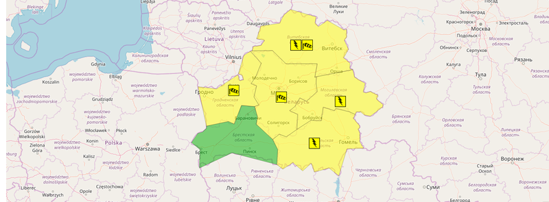 Усиление ветра прогнозируется в Минске. Грозы ожидаются в Гродненской, Витебской и Могилевской областях.