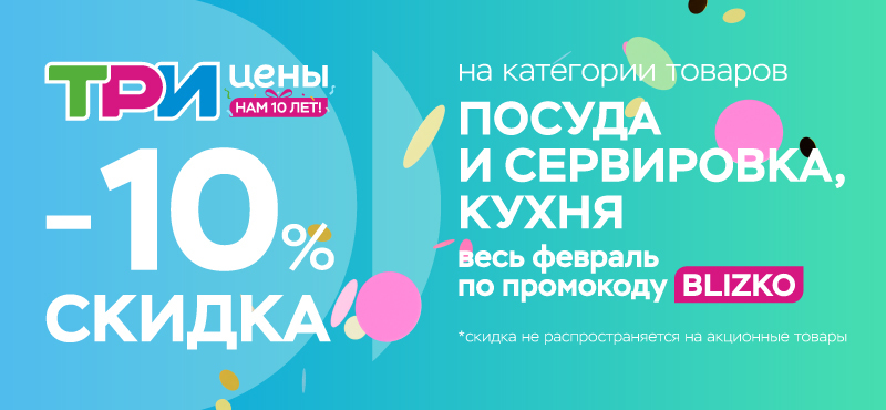 Так, с 1 по 28 февраля действует скидка 10% по промокоду BLIZKO на категории товаров: посуда и сервировка, кухня. Назовите промокод на кассе до закрытия чека. Скидка не распространяется на акционные товары.