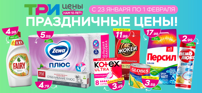 По 1 февраля делать покупки здесь станет еще выгоднее. «Три цены» отмечает день рождения — в этом году магазину исполняется 10 лет. По этому приятному поводу магазин подготовил для своих покупателей специальные праздничные предложения.