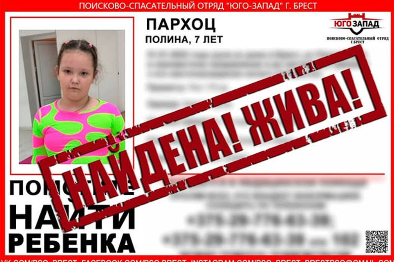 Полина Пархоц, семилетняя девочка, пропавшая под Брестом вчера, 1 августа, жива. Об этом сообщает поисково-спасательный отряд «Юго-Запад» Брест в своих соцсетях. Ребенка нашли сотрудники милиции. Поисковики благодарят всех, кто помогал в информировании.