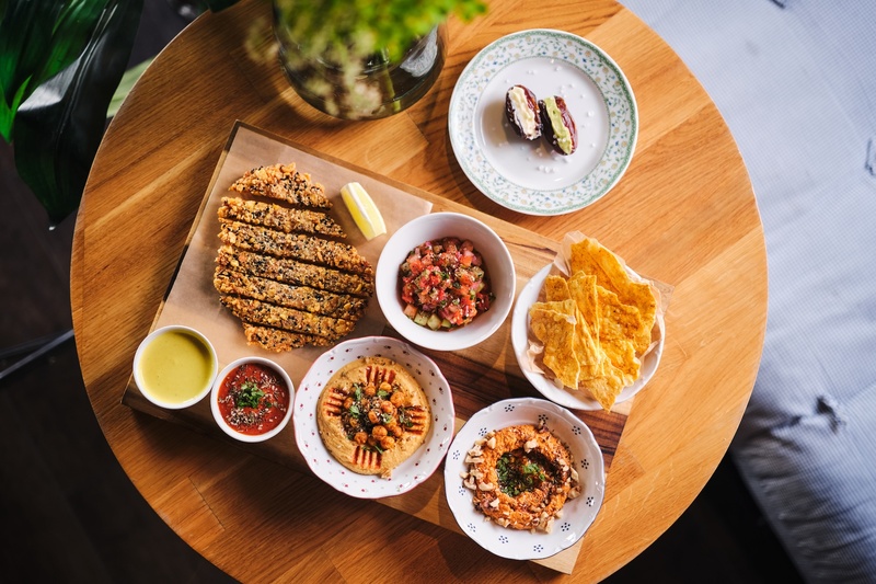 - Хрустящий шницель из цыпленка с черным кунжутом и копченой паприкой, залитый лимонной тахиной (может быть заменен на фалафель для вегетарианцев)