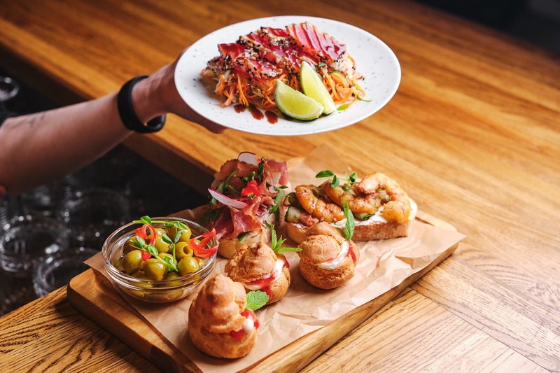 - Брускетта с креветкой, помидором черри, кунжутом и соусом терияки