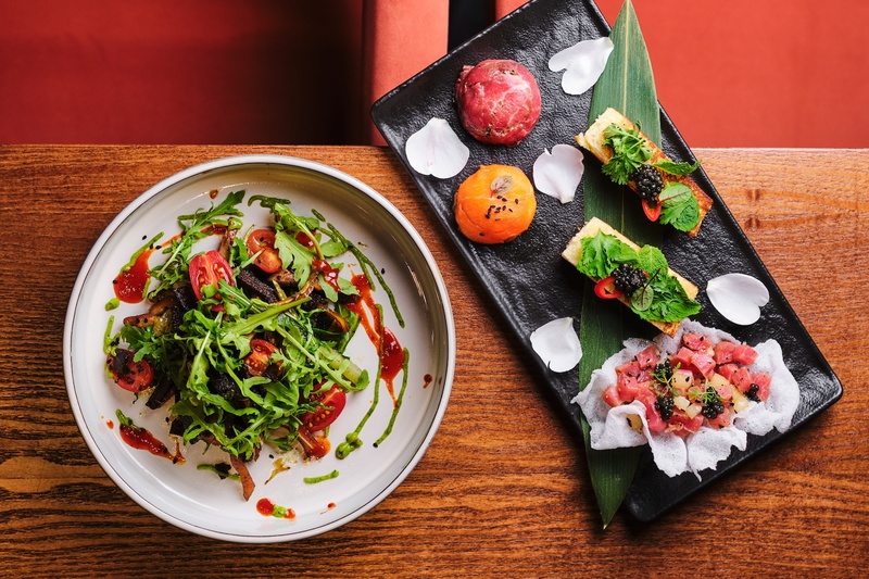 - Тартар из тунца с ромовым ананасом, рисовыми чипсами и бальзамической икрой