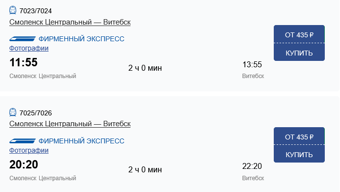 Из Витебска в Смоленск и из Смоленска в Витебск полный билет стоит от 435 российских рублей. По актуальному курсу Нацбанка Беларуси это 15,88 белорусского рубля.
