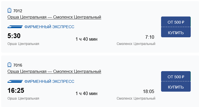Из Орши в Смоленск и из Смоленска в Оршу полный билет стоит от 500 российских рублей. По актуальному курсу Нацбанка Беларуси это 18,25 белорусского рубля.