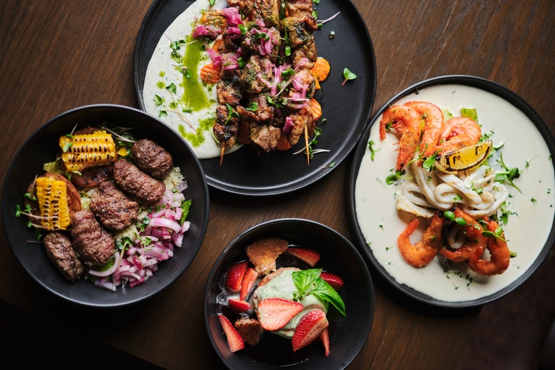 - Кабаби по-кавказски (жареные на решетке «колбаски» свинина-говядина), подается с медальонами сырного лаваша, репчатым луком и петрушкой