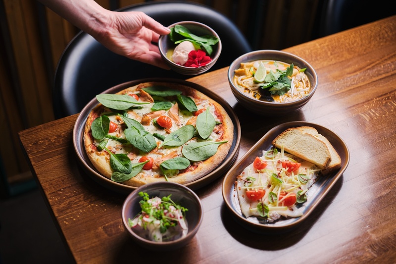 - Пицца с копченой горбушей, спаржей и молодым шпинатом
